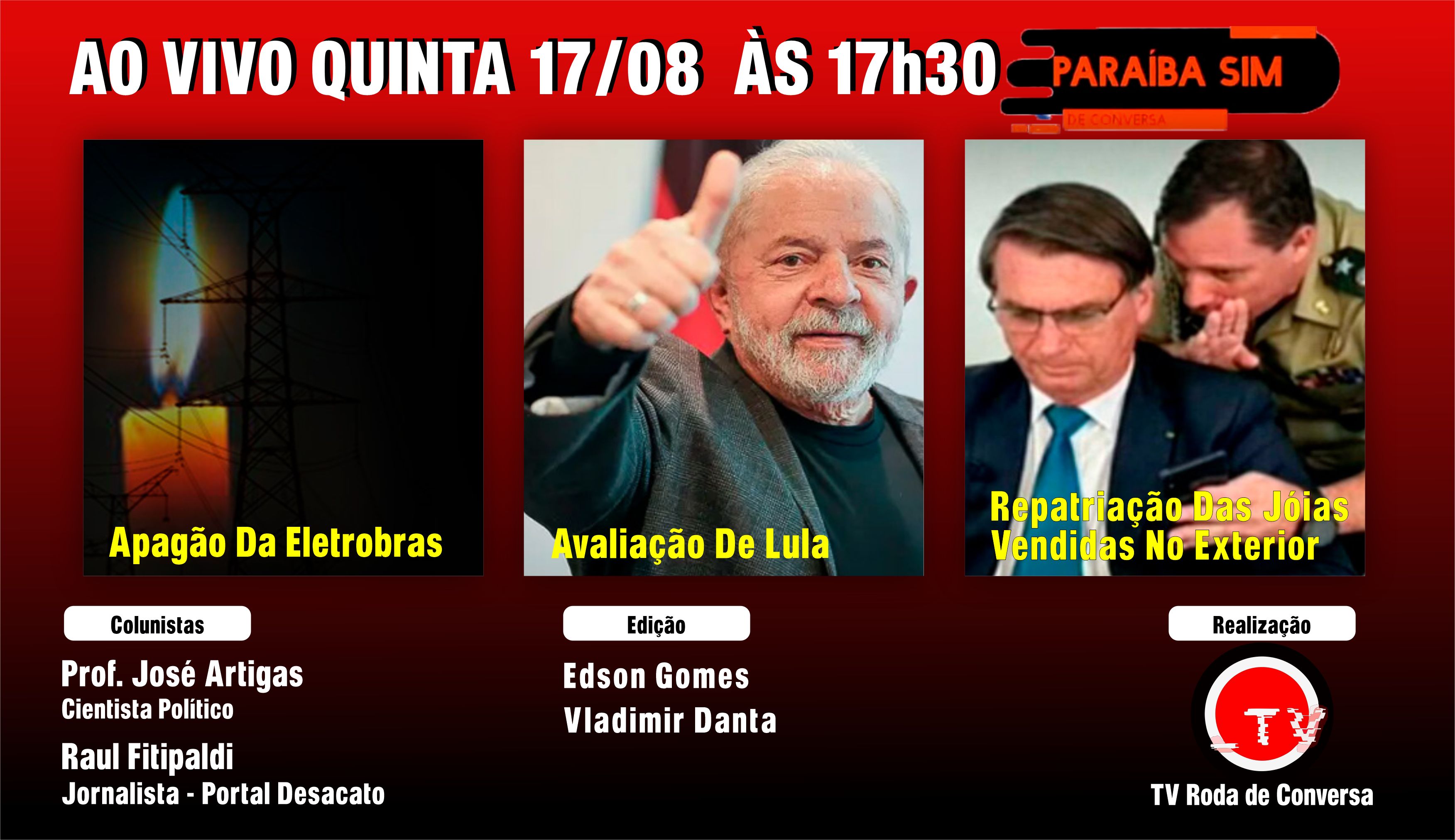 Apagão na Eletrobrás já começa a mostrar a verdadeira cara das privatizações. Lula aprovado por 60% do eleitorado com aumento visível no sul do país e entre os evangélicos e a repartição das joias vendidas no exterior. Vamos trazer esses assuntos do momento para serem discutidos no nosso programa desta Quinta-feira, às 17h30, no PARAÍBA SIM!