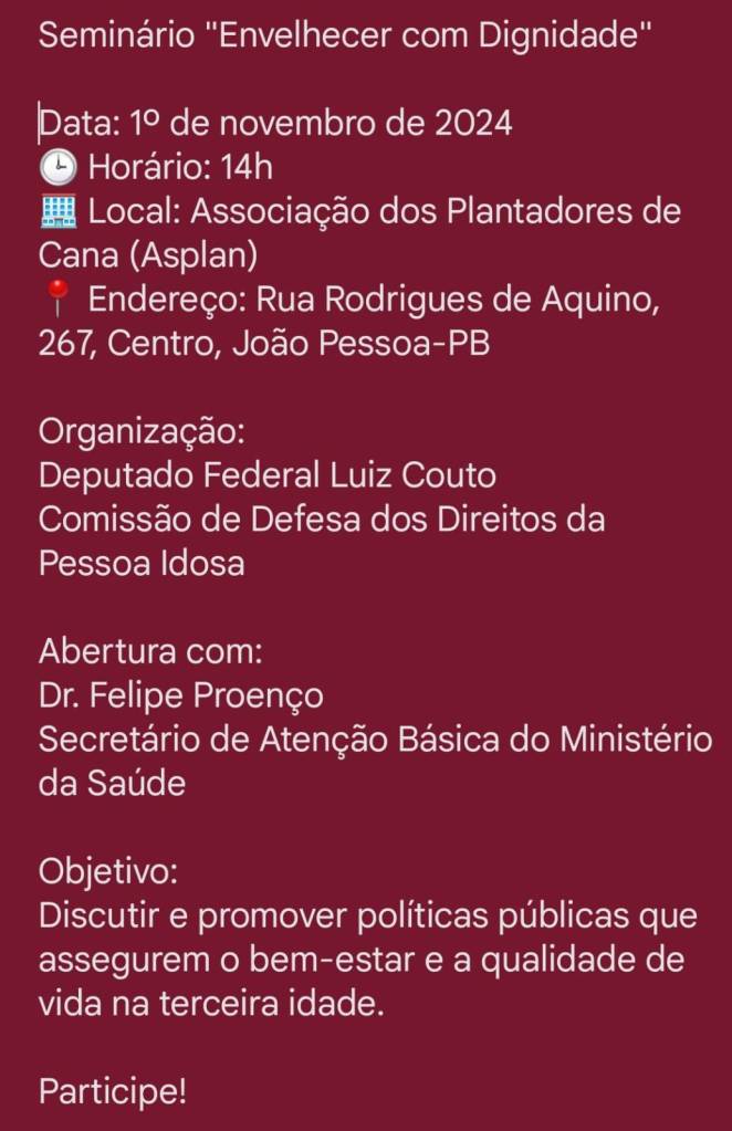 Nesse contexto, ele anunciou um seminário promovido pela Comissão de Direitos e Defesa da Pessoa Idosa, intitulado “Envelhecer com Dignidade”, que ocorrerá no dia 1º de novembro de 2024. O evento será uma oportunidade para discutir a realidade enfrentada pelos idosos e propor soluções, mobilizando a sociedade em prol de um envelhecimento mais digno e seguro.