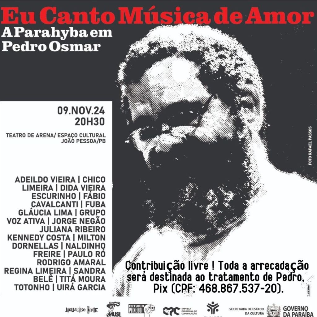 Os grandes nomes do cenário musical paraibano que se reunirão amanhã dia 09 de novembro para um grande show intitulado “eu canto música de Amor”, que apesar de ter entrada franca, é um estímulo para que as pessoas doem qualquer valor para ajudar o reestabelecimento da saúde do mestre multiartista Paraibano Pedro Osmar, que recentemente foi acometido de um AVC.